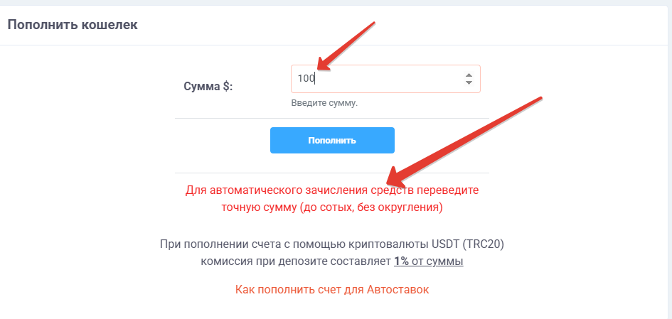 Чтобы пополнить счет, перейдите в свой кошелек, введите сумму на которую вы хотите пополнить свой баланс для автоставок или оплаты подписок: